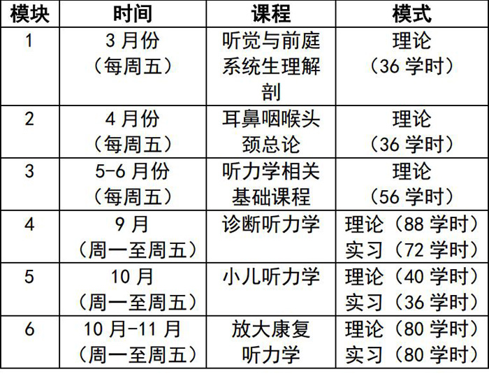 2.进修课程:依托首都医科大学听力学本科教育课程,每年开办听力学专业培训课程;进修人员将统一按照课程表安排进修;
